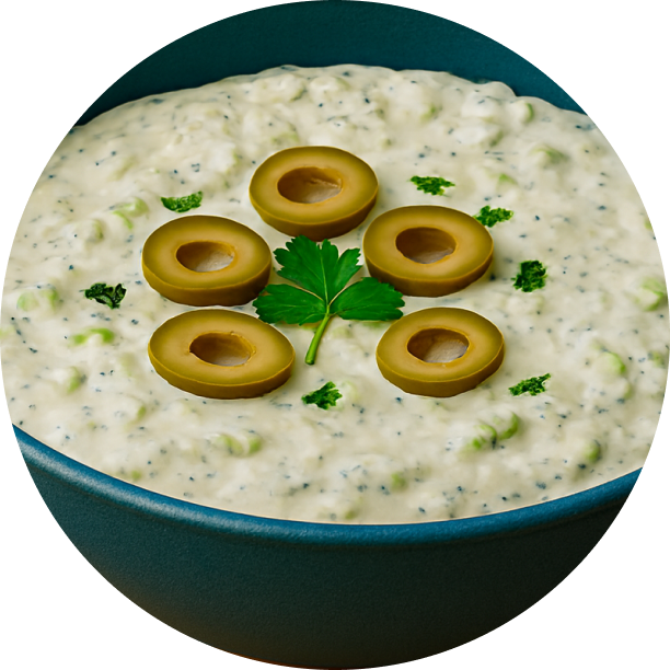 Creamy chickpea blend topped with olive oil, black olives, and a hint of paprika for authentic Mediterranean flavor.
